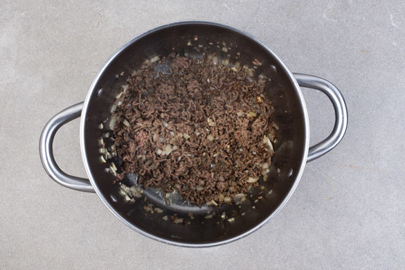 Das Hackfleisch in einem mittelgroßen Topf mit 2–3EL Olivenöl bei starker Hitze ca. 5Min. krümelig anbraten. Die Zwiebeln und den Knoblauch zugeben und 1–2Min. mitbraten. Mit Salz und Pfeffer würzen.