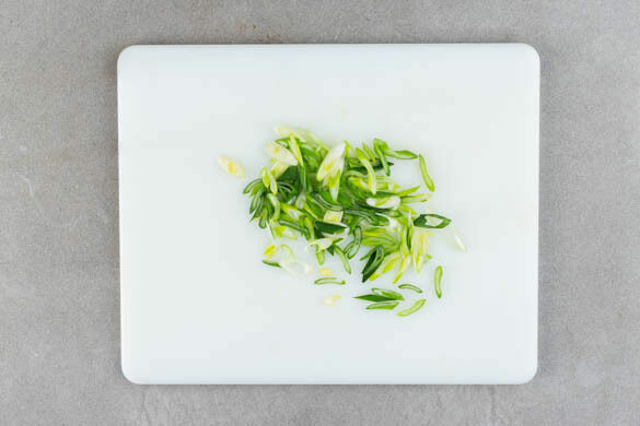 Die Lauchzwiebel in feine Ringe schneiden. Das Hähnchenblankett mit dem Reis anrichten und mit Lauchzwiebeln garniert servieren.