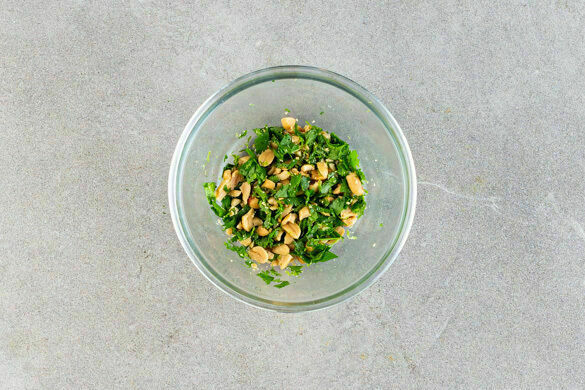 Die Erdnüsse grob hacken. Den Koriander samt Stängeln grob schneiden. Die Erdnüsse, den Koriander und die Limettenschale vermengen. Die Rindfleisch-Paprika-Pfanne auf dem Reis anrichten und mit den Koriander-Erdnüssen garniert servieren.