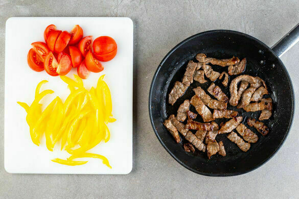 Die Paprika in dünne Streifen, die Tomaten in Spalten schneiden. Das Fleisch trocken tupfen und mit 1EL Pflanzenöl und 1 Prise Salz in einer großen Pfanne bei starker Hitze ca. 1Min. scharf anbraten, das Fleisch muss noch nicht gar sein. Aus der Pfanne nehmen und beiseitestellen, die Pfanne nicht auswischen und erneut stark erhitzen.