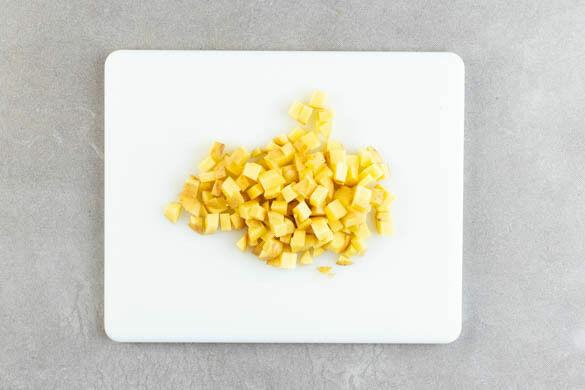 Die übrigen Kartoffeln samt Schale in 1–2cm kleine Würfel schneiden.