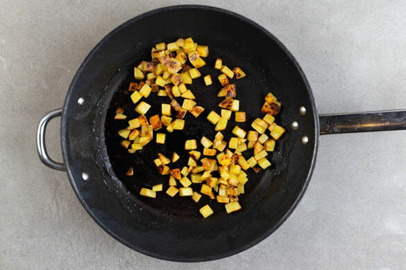 Die Kartoffelwürfel in einer mittelgroßen Pfanne mit 2TL Olivenöl und ½TL Salz bei mittlerer Hitze ca. 8Min. anbraten, dabei gelegentlich umrühren.