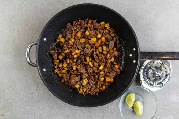 Das Hackfleisch und die ½ des Paprikapulvers hinzufügen und ca. 4Min. mitbraten, bis das Hackfleisch knusprig ist und die Kartoffeln gar sind. Die Limette halbieren, eine Hälfte auspressen und die andere Hälfte in Spalten schneiden.