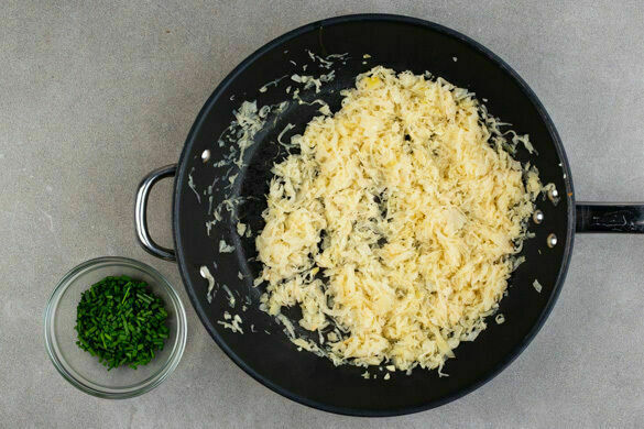 Den Knoblauch in einer zweiten großen Pfanne mit 1EL Butter bei mittlerer Hitze 1–2Min. anbraten, dann das Sauerkraut hinzugeben und weitere 2–3Min. braten. Den Schnittlauch grob schneiden. Die Spätzle samt Rinderhack auf Teller verteilen, das Sauerkraut darauf anrichten und mit dem Schnittlauch garniert servieren.