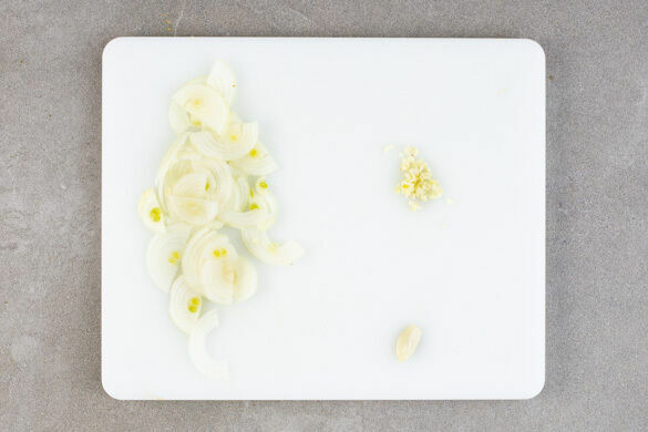 Den Backofen auf 220°C (200°C Umluft) vorheizen. In einem Wasserkocher 1L Wasser aufkochen. Die Zwiebeln schälen, halbieren und fein würfeln. Den Knoblauch schälen, 1 Knoblauchzehe fein würfeln, die übrige Knoblauchzehe halbieren.