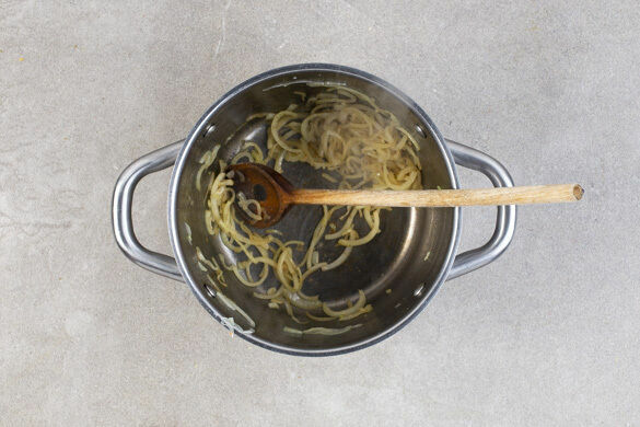 Die Zwiebeln in einem großen Topf mit 2EL Olivenöl bei mittlerer Hitze 2–3Min. glasig anschwitzen. Den gewürfelten Knoblauch und die Gewürzmischung hinzugeben und ca. 30Sek. mitbraten.