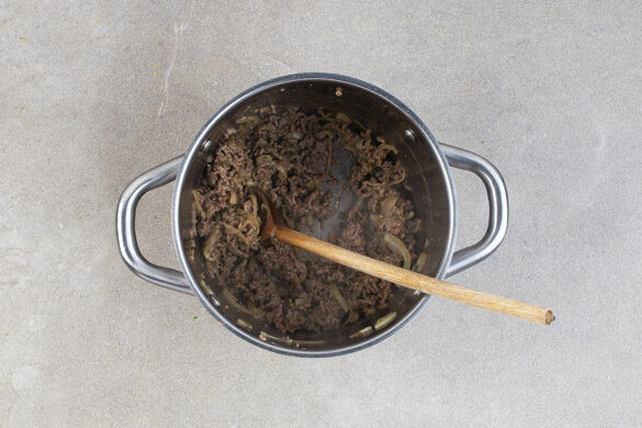 Das Hackfleisch mit der Gewürzmischung in den Topf geben und 4–5Min. krümelig anbraten, bis das Fleisch leicht gebräunt ist. Das Brötchen halbieren, auf ein Backblech legen und die Schnittflächen dünn mit insgesamt 2TL Olivenöl bestreichen sowie mit je 1 Prise Salz und Pfeffer bestreuen. Im Ofen 5–8Min. knusprig aufbacken.