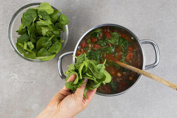 Wenn Kreuzkümmel zart duftet und die aromatische Suppe mit Bio-Rinderhack mit Tomaten und Kichererbsen vor sich hin köchelt, läuft dir das Wasser schon im Munde zusammen. Nur gut, dass es heute nicht lange dauert. Noch ein bisschen Babyspinat in die Suppe und das Baguette aufknuspern, schon ist das Essen fertig!