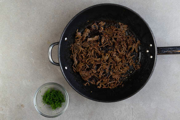 Das Hackfleisch mit dem Gulaschgewürz in die Pfanne rühren und mit je 1 kräftigen Prise Salz und Pfeffer bei mittlerer bis starker Hitze 5–7Min. braten. Tipp: Nur wenig umrühren, damit das Hackfleisch schön knusprig wird. Mit Salz und Pfeffer abschmecken und bei niedrigster Hitze warm halten. Inzwischen den Dill fein schneiden.