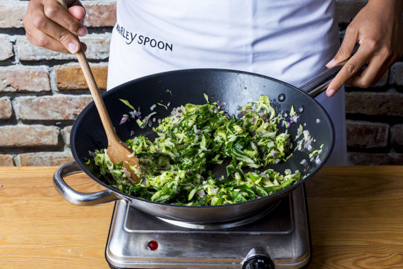 Die Zwiebeln in einer großen Pfanne mit 1–2EL Olivenöl bei mittlerer Hitze ca. 2–3Min. anschwitzen. Den Knoblauch und die Zucchini hinzugeben und 6–8Min. anbraten, bis das Gemüse leicht gebräunt ist. Ca. 2/3 des Spinats untermischen, das Gemüse mit Pfeffer würzen und etwas abkühlen lassen. Die Pfanne vom Herd nehmen.