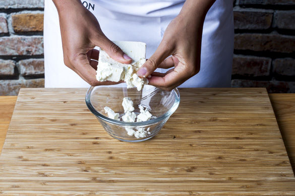 Den Feta mit den Fingern oder einer Gabel zerkrümeln und mit dem Gulaschgewürz und den Kräutern vermengen. Anschließend mit dem Gemüse gründlich mischen.