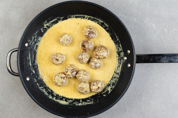 Die Hackbällchen in einer großen Pfanne mit 1EL Pflanzenöl bei mittlerer bis starker Hitze 4–5Min. von allen Seiten goldbraun braten. Dann bei niedriger Hitze langsam die restliche Sahne und die ½ des Brühgewürzes dazugeben und die Sauce ca. 2Min. köcheln lassen. Mit ggf. mehr Brühgewürz abschmecken.