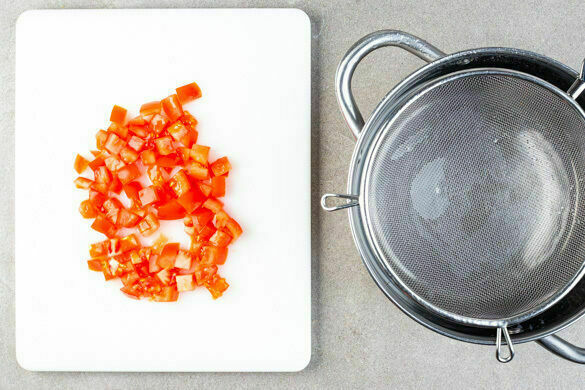 Einen großen Topf mit Wasser bis unter den Dampfkorb füllen und das Wasser zum Kochen bringen. Tipp: Statt dem Dampfkorb kann auch ein passendes Sieb verwendet werden. Die Tomaten in ca. 1cm große Würfel schneiden.