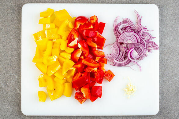 In einem mittelgroßen Topf ausreichend gesalzenes Wasser für die Pasta zum Kochen bringen. Die Paprika vierteln, entkernen und in 2–3cm große Stücke schneiden. Die Zwiebel schälen, halbieren und in dünne Streifen schneiden. Den Knoblauch schälen und fein würfeln.