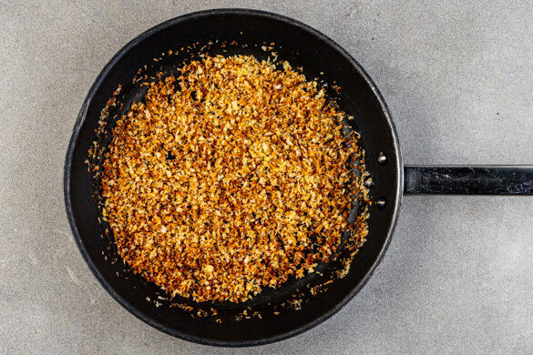 Inzwischen das Panko-Paniermehl und den Knoblauch in einer mittelgroßen Pfanne mit 1EL Butter bei mittlerer bis starker Hitze in 3–4Min. goldbraun anrösten und nach Geschmack mit Salz und Pfeffer würzen. Aus der Pfanne nehmen und beiseitestellen.