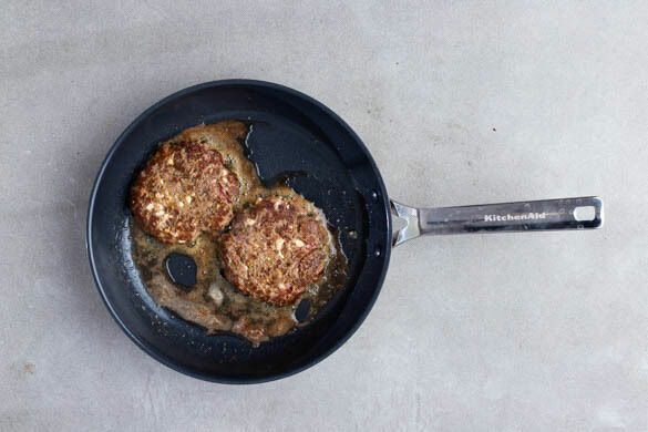 Den Feta zerkrümeln. Das Eigelb vom Eiweiß trennen. Das Hackfleisch mit ¼ des Fetas, der griechischen Gewürzmischung, dem Eigelb und je ½TL Salz und Pfeffer verkneten. 4 ca. 1cm flache Pattys formen und in der Mitte etwas eindrücken. Die Walnüsse in einer großen Pfanne ohne Zugabe von Fett bei mittlerer Hitze 1–2Min. anrösten und herausnehmen. Die Pfanne aufbewahren.