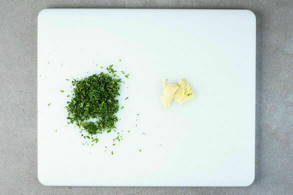 Den Backofen auf 245°C (225°C Umluft) vorheizen. Die Oreganoblätter von den Stängeln zupfen und fein schneiden. Den Knoblauch schälen und mit der breiten Seite eines Messers leicht zerdrücken.