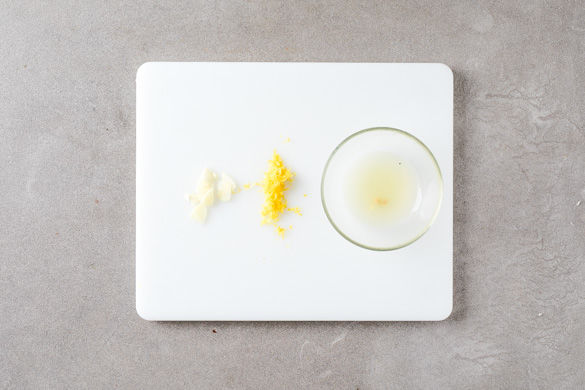 Den Knoblauch schälen und in feine Scheibchen schneiden. Die Zitronenschale abreiben, dann die Zitrone halbieren und auspressen. Tipp: Die Zitrone vor dem Auspressen mit der flachen Hand und leichtem Druck auf der Arbeitsfläche rollen, so lässt sie sich leichter auspressen.