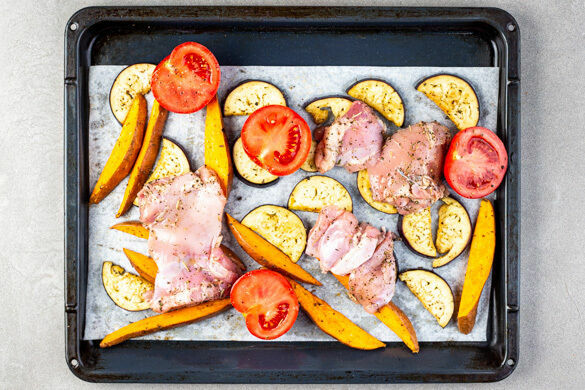 Das Fleisch und die Tomaten nach ca. 15Min. Garzeit zu dem Gemüse auf das Backblech geben und im Ofen 20–25Min. backen, bis das Fleisch gar und das Gemüse appetitlich gebräunt ist.