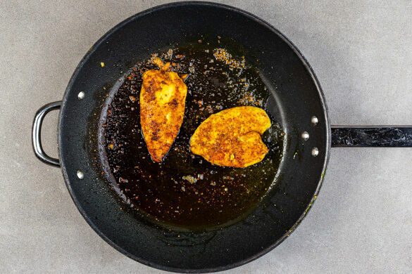 Das Fleisch trocken tupfen und jeweils der Länge nach in 2 gleich große Stücke schneiden. Mit dem restlichen Currypulver, dem Knoblauch und 2EL Pflanzenöl vermengen.