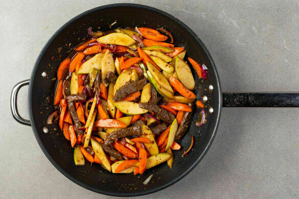 Die Zwiebeln in derselben Pfanne mit 1EL Pflanzenöl bei starker bis mittlerer Hitze 1–2Min. braten, dann die Karotten, die Birnen und den Knoblauch hinzufügen und weitere 1–2Min. braten. Das Fleisch wieder in die Pfanne geben, mit ¾ der Sojasauce, der Sweet-Chili-Sauce und 200ml Wasser ablöschen. Noch ca. 1Min. kochen lassen und mit Salz und Pfeffer abschmecken.