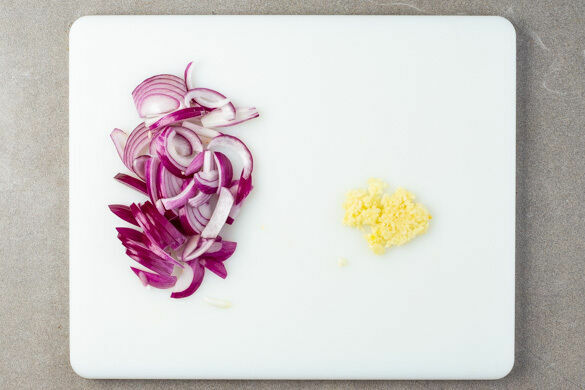 In einem mittelgroßen Topf 600ml leicht gesalzenes Wasser für den Reis zum Kochen bringen. Die Zwiebel schälen, halbieren und in feine Streifen schneiden. Den Knoblauch schälen und fein würfeln.