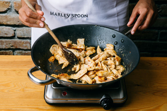 Die Hähnchenstreifen in einer großen Pfanne bei starker Hitze ca. 3–4Min. rundum scharf anbraten. Währenddessen in einem Wasserkocher 1,5L Wasser zum Kochen bringen.