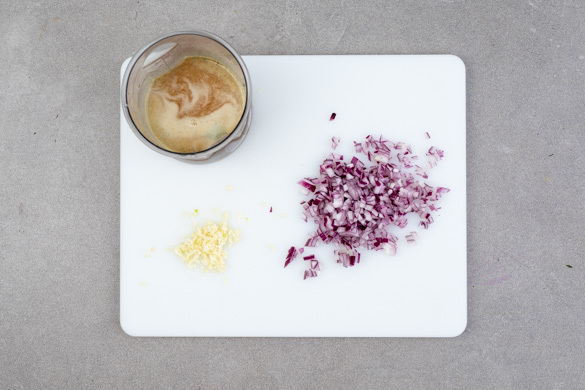 Den Backofen auf 240°C (220°C Umluft) vorheizen. Das Fleisch 20–30Min. vor der Zubereitung aus dem Kühlschrank nehmen und Raumtemperatur annehmen lassen. Die Zwiebel und den Knoblauch schälen, halbieren und in feine Würfel schneiden. Die ½ des Brühgewürzes in 250ml heißem Wasser auflösen.