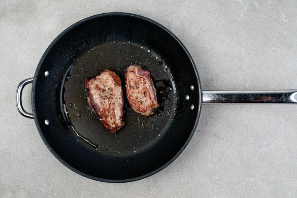 Das Fleisch trocken tupfen und in einer ofenfesten Pfanne mit 1EL Öl bei starker Hitze auf jeder Seite ca. 1Min. scharf anbraten. Mit Salz und Pfeffer würzen und je nach gewünschtem Gargrad 5–10Min. in den Ofen geben. Tipp: Bei 5Min. werden die Steaks „blutig“, bei 10Min. „gut durch“. Die Steaks in Tranchen schneiden und mit dem Ratatouille und den Kartoffeln servieren.