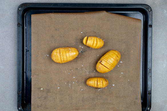 Die Kartoffeln samt Schale mit einem scharfen Messer in Abständen von 2–3mm ein-, aber nicht durchschneiden: Sie sollen nicht auseinanderfallen, sondern fächerartig aufklappen. Die Kartoffeln auf ein mit Backpapier ausgelegtes Backblech geben, mit 1 Prise Salz und 1EL Olivenöl einreiben und 35–45Min. backen, bis sie goldbraun und gar sind.