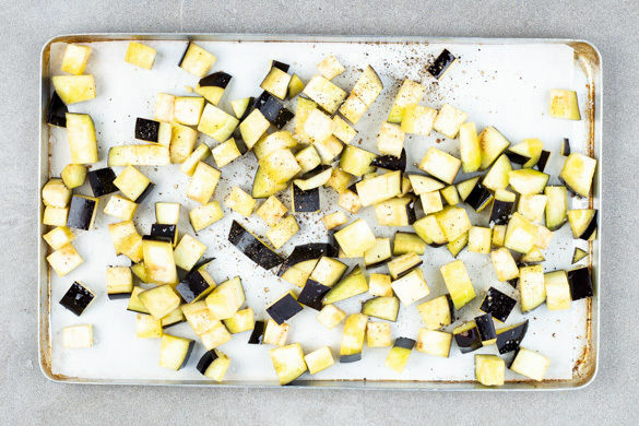 Den Backofen auf 220°C (200°C Umluft) vorheizen. Die Aubergine in 2–3cm große Würfel schneiden, mit 1EL Olivenöl sowie je 1 kräftigen Prise Salz und Pfeffer vermengen und auf einem mit Backpapier ausgelegten Backblech 17–20Min. im Ofen weich rösten.