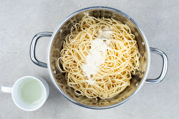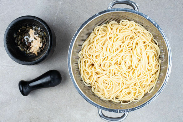 Die Pasta in das kochende Wasser geben und in 7–9Min. bissfest kochen. Ca. 1 Tasse Pastawasser abschöpfen, dann die Pasta in ein Sieb abgießen und abtropfen lassen. Die Kürbiskerne in der kleinen Pfanne ohne Zugabe von Fett bei mittlerer Hitze 2–4Min. anrösten. Aus der Pfanne nehmen und mit den restlichen Hefeflocken sowie 1 Prise Salz in einem Mörser fein zerstoßen.