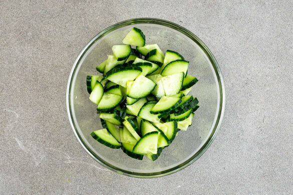 Inzwischen die Gurke längs vierteln, quer in ca. 0,5cm dünne Scheiben schneiden, mit 2EL Essig, 1TL Salz sowie ½TL Zucker vermengen und bis zum Servieren im Kühlschrank aufbewahren.