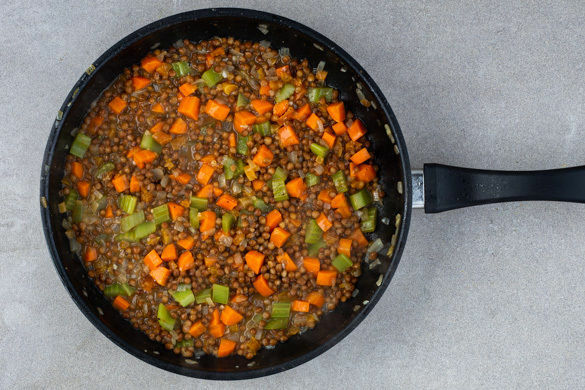 Den Lauch, die Karotten und den Sellerie in derselben Pfanne mit 2EL Olivenöl bei mittlerer Hitze 2–3Min. farblos anschwitzen. Den Knoblauch und die Datteln untermischen. Mit den Linsen samt Flüssigkeit ablöschen, alles kurz aufkochen lassen und 2–3Min. sanft köcheln. Nach Geschmack mit der Gewürzmischung, Salz, Pfeffer und Essig würzen.