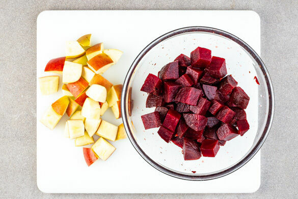 Die ½ der Roten Bete in ein Sieb abgießen, abtropfen lassen und in grobe Würfel schneiden. Tipp: Da Rote Bete stark färbt, beim Verarbeiten am besten Küchenhandschuhe und Schürze tragen. 2EL Essig, ½TL Zucker und ½TL Salz verrühren und mit der Roten Bete vermengen. Den Apfel in grobe Stücke schneiden, dabei die Kerne entfernen.