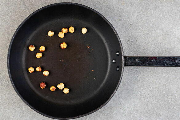 Die Haselnüsse in einer mittelgroßen Pfanne ohne Zugabe von Fett bei mittlerer Hitze 1–2Min. goldbraun anrösten. Vorsicht, sie können schnell zu dunkel werden. Zum Abkühlen aus der Pfanne nehmen und grob hacken.