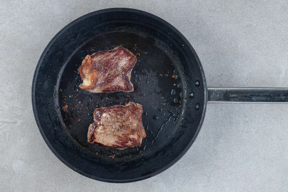 Das Fleisch trocken tupfen und in einer großen Pfanne mit 2EL Olivenöl bei starker Hitze auf jeder Seite 2–3Min. braten, abhängig davon, ob es medium oder eher durchgebraten sein soll. Aus der Pfanne nehmen und bis zum Servieren auf einem Teller abgedeckt ruhen lassen.