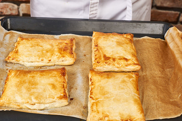 Die Teigtaschen im Ofen ca. 15–20Min. goldbraun backen. Tipp: Wer mag, kann die Teigtaschen auch bei 200°C Ober-/Unterhitze nacheinander backen.