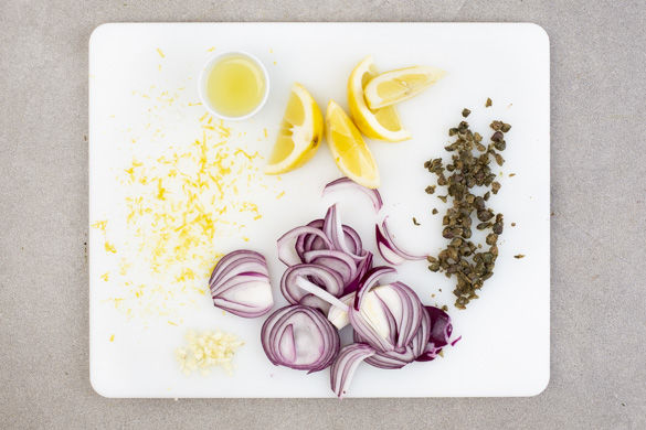 Die Zwiebeln schälen und in feine Streifen schneiden. Den Knoblauch schälen und fein hacken. Die Kapern in einem Sieb mit Wasser abspülen, auf etwas Küchenkrepp trocknen und anschließend grob hacken. Die Schale einer Zitrone abreiben, dann die Zitrone auspressen. Die zweite Zitrone in Spalten schneiden.
