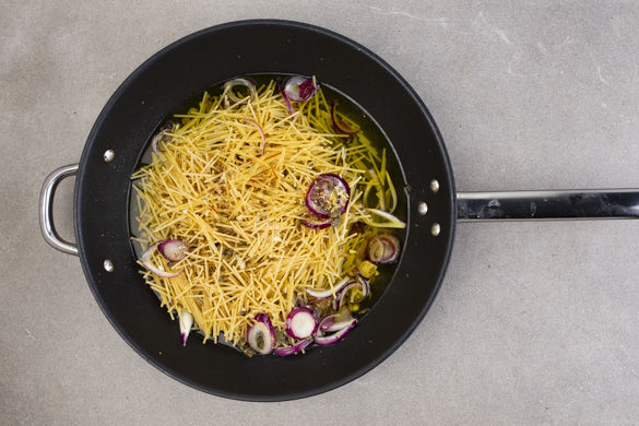 Die Zwiebeln und die Kapern in der Pfanne mit 2EL Olivenöl bei mittlerer Hitze ca. 2–3Min. anbraten, bis die Zwiebeln leicht goldbraun werden.