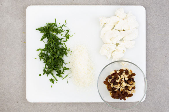 Die Petersilienblätter von den Stängeln zupfen und fein hacken. Den Hartkäse fein reiben. Den Mozzarella mit den Fingern in kleine Stücke reißen. Die Pinienkerne mit der Petersilie, dem Hartkäse, dem Mozzarella und den Rosinen vermengen.