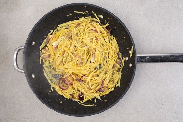 Die Spaghetti in ca. 2cm große Stücke brechen und mit dem Safranwasser, dem Knoblauch, der 1/2 der Zitronenschale und des -saftes sowie 1 Prise Salz und Pfeffer in die Pfanne geben und alles gut verrühren. Die Pasta abgedeckt bei niedriger Hitze ca. 10–12Min. sanft köcheln lassen. Bei Bedarf etwas mehr Wasser hinzugeben.