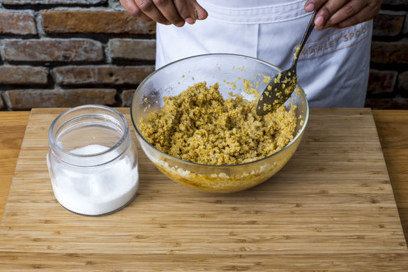 Inzwischen in einem Wasserkocher 800ml Wasser aufkochen. Den Bulgur mit dem kochenden Wasser übergießen und je nach Schärfewunsch mit der Gewürzmischung sowie 1 Prise Salz würzen. Den Bulgur abgedeckt 10–12Min. ziehen lassen. Ggf. überschüssige Flüssigkeit abgießen.