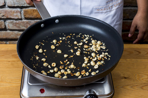 Die Haselnüsse grob hacken und in einer kleinen Pfanne ohne Zugabe von Fett 1–2Min. bei mittlerer Hitze rösten. Vorsicht, sie können schnell verbrennen. Die Nüsse zum Abkühlen aus der Pfanne nehmen. Den Feta mit einer Gabel oder den Fingern zerkrümeln.