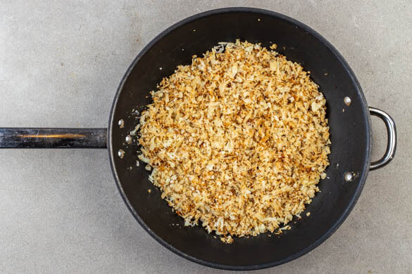 Den Blumenkohlreis in einer mittelgroßen Pfanne mit 1EL Pflanzenöl und je 1 kräftigen Prise Salz und Pfeffer bei mittlerer bis starker Hitze 12–14Min. braten, bis er gar ist. Zwischendurch umrühren.