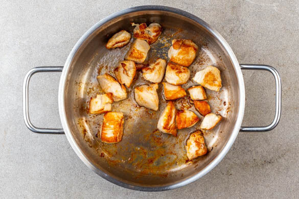 Das Fleisch trocken tupfen und in einem mittelgroßen Topf mit 1EL Pflanzenöl, 1 kräftigen Prise Salz und 1 Prise Pfeffer bei mittlerer Hitze in ca. 3Min. rundum goldbraun anbraten, das Fleisch muss noch nicht gar sein.
