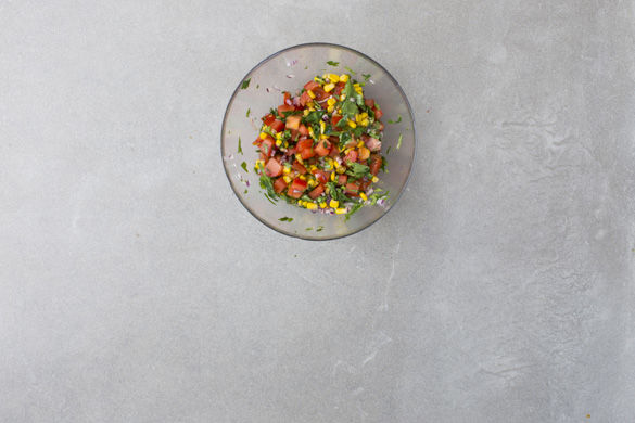 Die Tomaten in ca. 1cm große Würfel schneiden, dabei den Strunk entfernen. Die Korianderblätter von den Stängeln zupfen und fein hacken. Die Limettenschale abreiben, dann die Limette halbieren, eine Hälfte auspressen, die andere Hälfte in Spalten schneiden. Den Mais im Sieb abtropfen lassen.