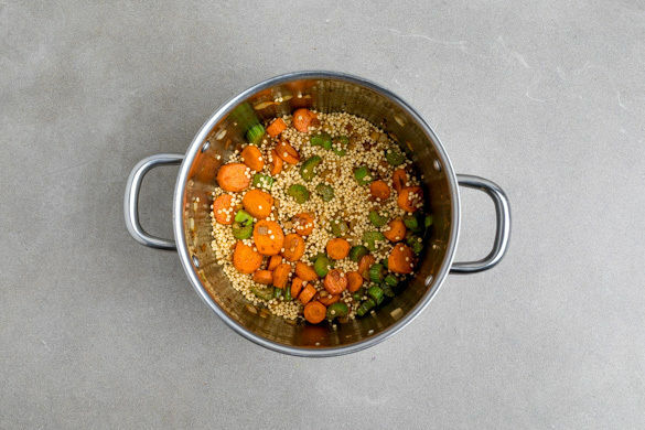 Das Gemüse und den Perlencouscous mit 1,7L Wasser ablöschen, das Brühgewürz hinzugeben und alles zum Kochen bringen. Bei mittlerer Hitze 5–6Min. köcheln lassen.