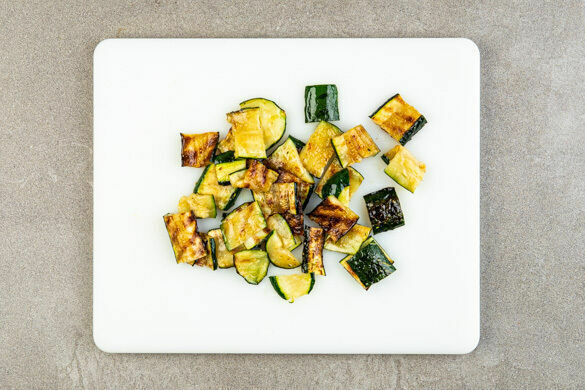 Die Zucchini längs halbieren und der Länge nach in ca. 1cm dünne Scheiben schneiden, dann in einer Grillpfanne oder normalen Pfanne bei mittlerer bis starker Hitze 2–3Min. auf jeder Seite braten. Währenddessen jede Seite mit je 1 Prise Salz würzen. Die Zucchinischeiben aus der Pfanne nehmen, mit 2EL Olivenöl vermengen und in ca. 2cm große Stücke schneiden. Die Pfanne aufbewahren.