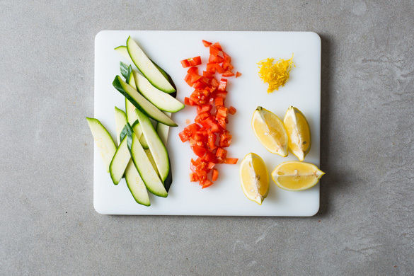 Die Zucchini längs halbieren und schräg in dünne Scheiben schneiden. Die Tomaten in feine Würfel schneiden, dabei den Strunk entfernen. Die Zitronenschale fein abreiben, dann die Zitrone halbieren, eine Hälfte auspressen, die andere Hälfte in Spalten schneiden.